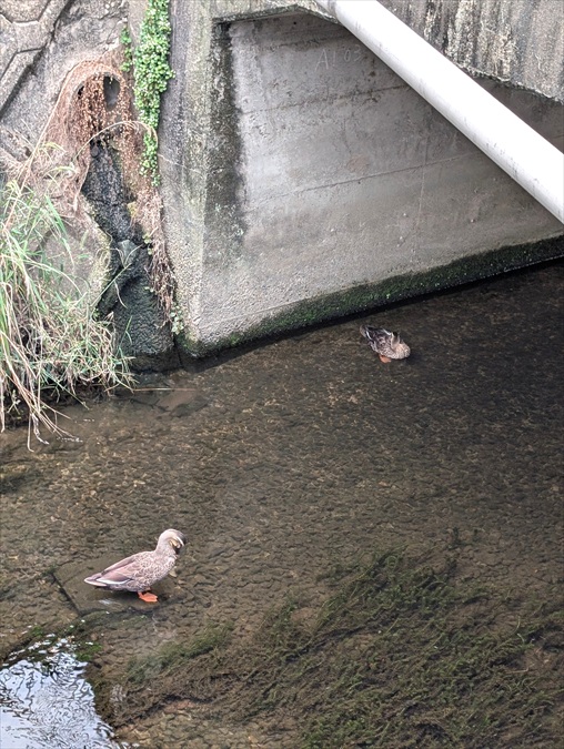 朝の犬の散歩中に遭遇していたカモの親子。